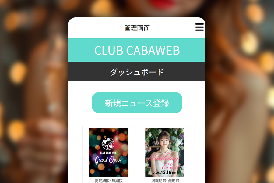 「きゃばWEB」のホームページ管理画面はナイトビジネスで重要なキャスト編集・出勤情報・リアルタイムニュースなどスマートフォンで簡単に更新できます。それに担当営業に22時まで連絡できるので内容の更新や画像制作などスピーディーにご対応。大抵のご依頼は即日対応いたしますので広告効果の高い実用的な運用ができます。
